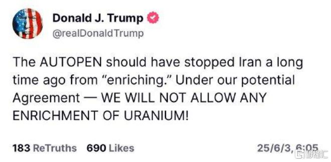 美国总统特朗普在社交媒体平台上表示:根据我们可能达成的(伊朗核)协议,我们将不允许任何铀浓缩!此前有媒体报道,美国对伊核谈判政策出现180度转变,拟允许伊朗在其领土上进行有限的低水平铀浓缩活动。受消息刺激WTI原油期货短线美元。