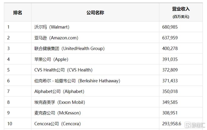 从整体来看,今年的上榜门槛从去年的71亿美元上升至74亿美元。榜上全部500家公司总收入由去年的18.8万亿美元上升到19.91万亿美元,较前一年增长约6%。上榜公司总收入相当于美国当年GDP的三分之二。在今年的榜单上,沃尔玛凭借其营业收入连续第十三年位列榜首,亚马逊连续六年位列第二,联合健康集团超越苹果公司,位列第三。