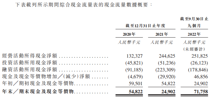截至2020年末、2021年末及2022年9月30日,德生堂的经营活动所得现金净额分别为1.32亿元、2.45亿元和2.52亿元。