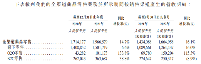 目的持续完善。截至2020年及2021年12月31日止年度以及截至2022年9月30日止九个月,公司全渠道药品零售业务的营收分别为17.14亿元、19.67亿元、16.65亿元,分别占总营收的97.7%、97.6%及97.5%。