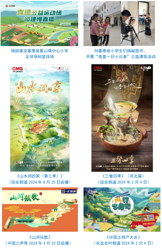赋能乡村振兴。定点帮扶四川喜德县,培训基层干部、乡村振兴带头人、专业技术人才2435名。发起《“喜”迎丰收 “德”天独厚》公益直播带货活动,成交额超1.2亿元。《山水间的家(第三季)》《三餐四季》《山河弦歌》《中国土特产大会》等节目聚力文旅合作,为乡村振兴提供新动能。